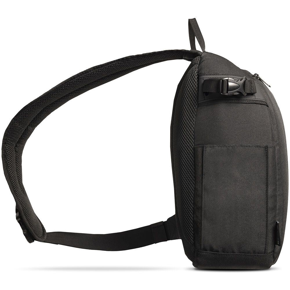 Designed to fit snugly against the body, this black Canon 100S Sling Camera Backpack can be rotated from your back to your front, so you can easily reach into its camera compartment. A large zippered opening gives you full access to the main 13.1 x 8 x 4.5" compartment where, using the included set of dividers, you can keep a DSLR camera, one to two lenses, plus accessories. The exterior is made from lightweight and water-resistant nylon with padding to protect your gear and make it comfortable to wear. It has a wide adjustable strap that can be worn across the body and a soft handle on the top for easy grab-and-go or to hang it on a hook. For additional storage there is a large front pocket for a tripod and/or accessories.